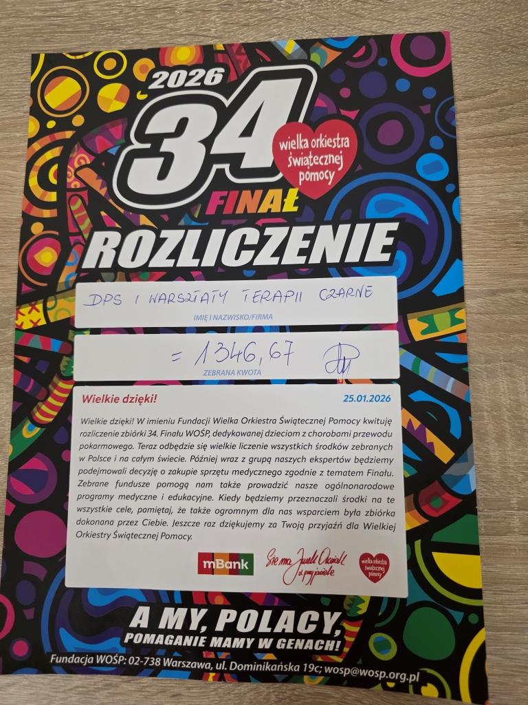 Cel 34. Finału WOŚP , który zagrała 25 stycznia 2026 roku to: Diagnostyka i leczenie chorób przewodu pokarmowego u najmłodszych pacjentów. Gramy z hasłem: Zdrowe brzuszki naszych dzieci. Uczestnicy WTZ „Promyk” wzięli udział w tym przedsięwzięciu : jako wolontariusze zbierali fundusze do puszki, zaprezentowali swoje talenty wokalne na finałowej scenie WOŚP CCK w Czarnem oraz przekazali swoje rękodzieła na licytacje. Jesteśmy zaangażowani i pomagamy!