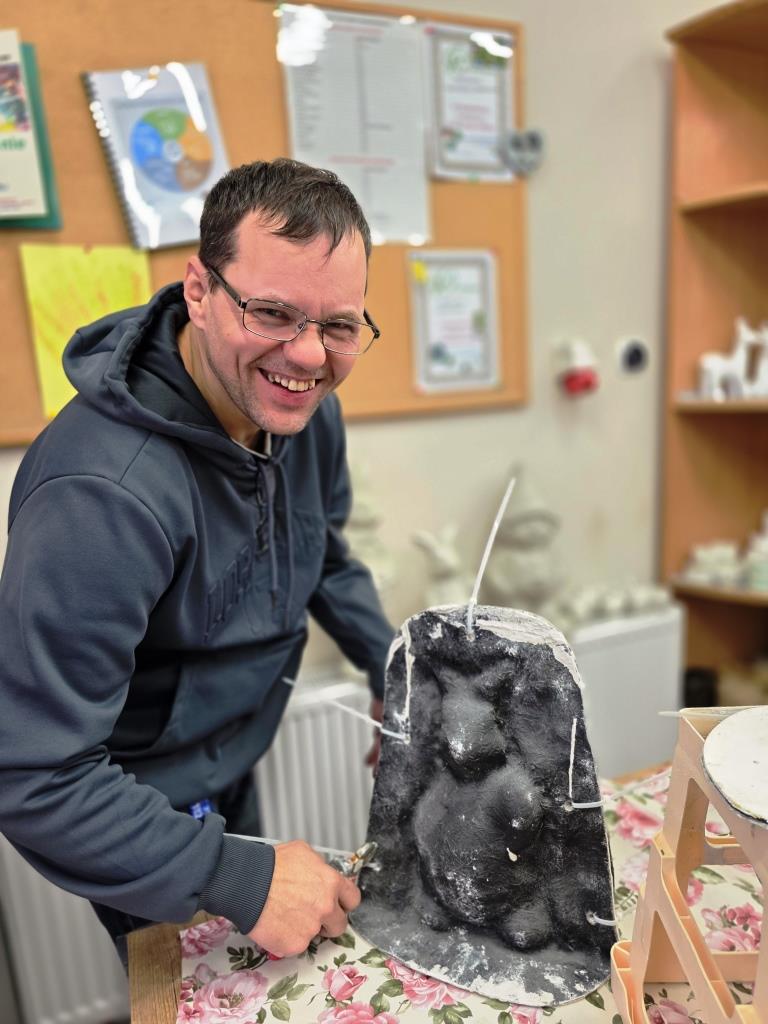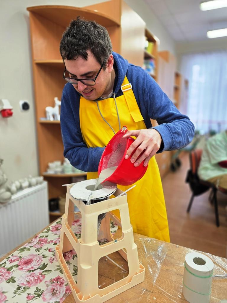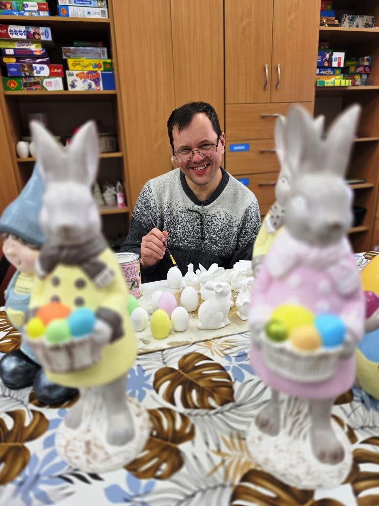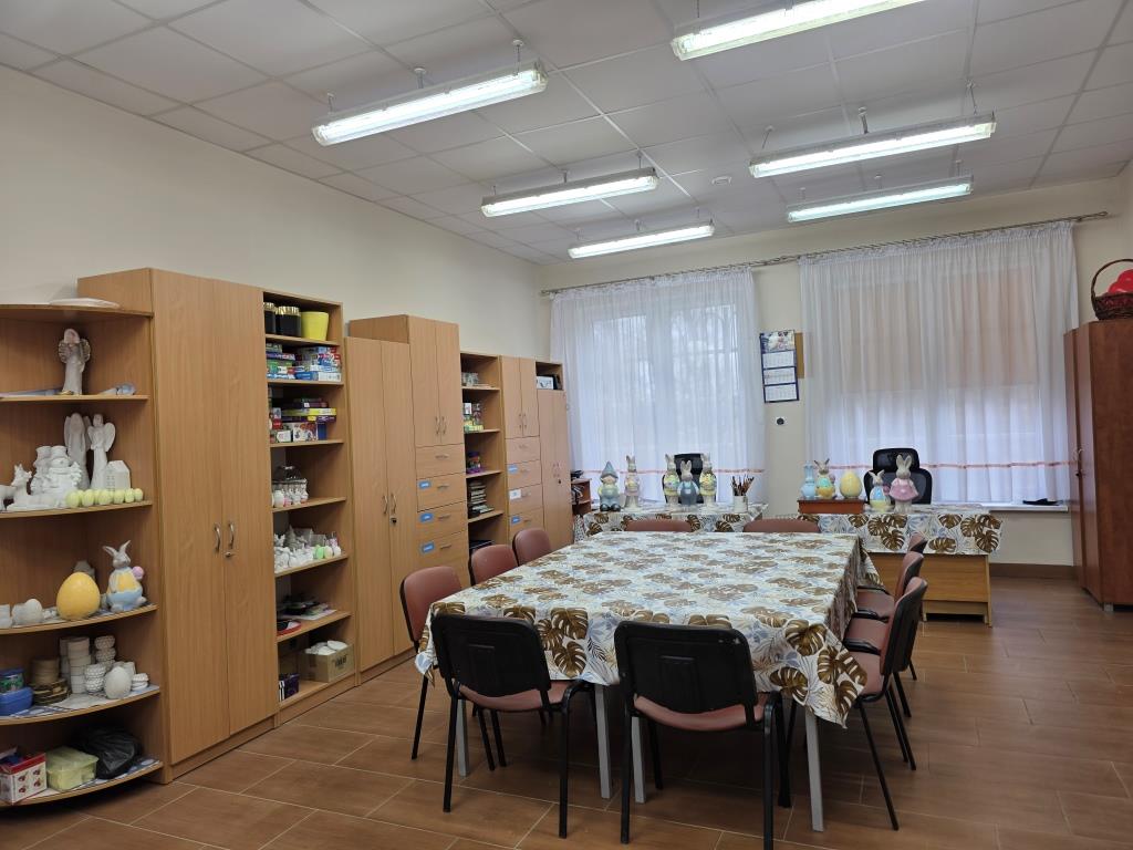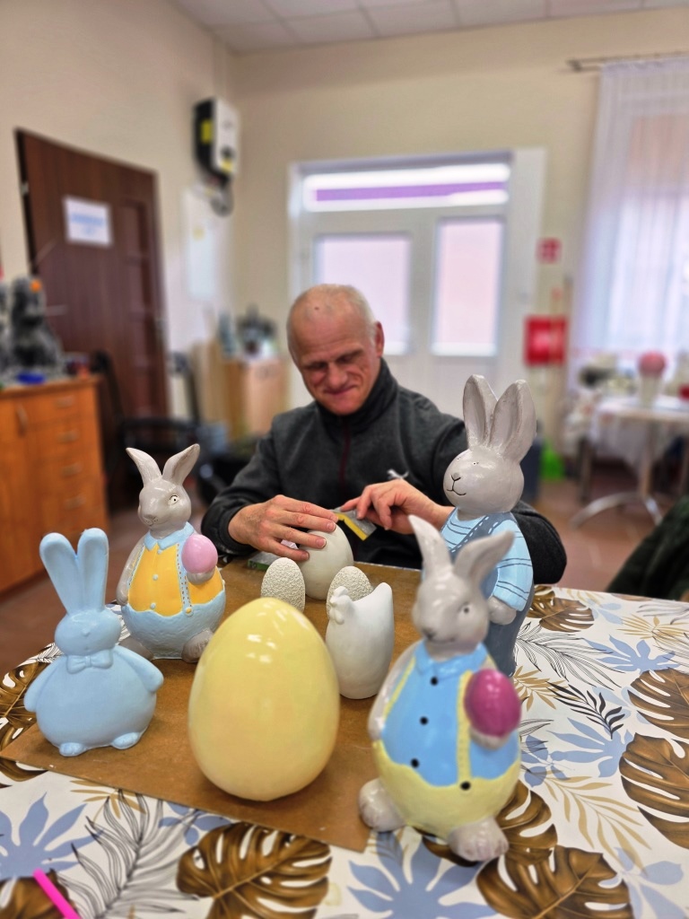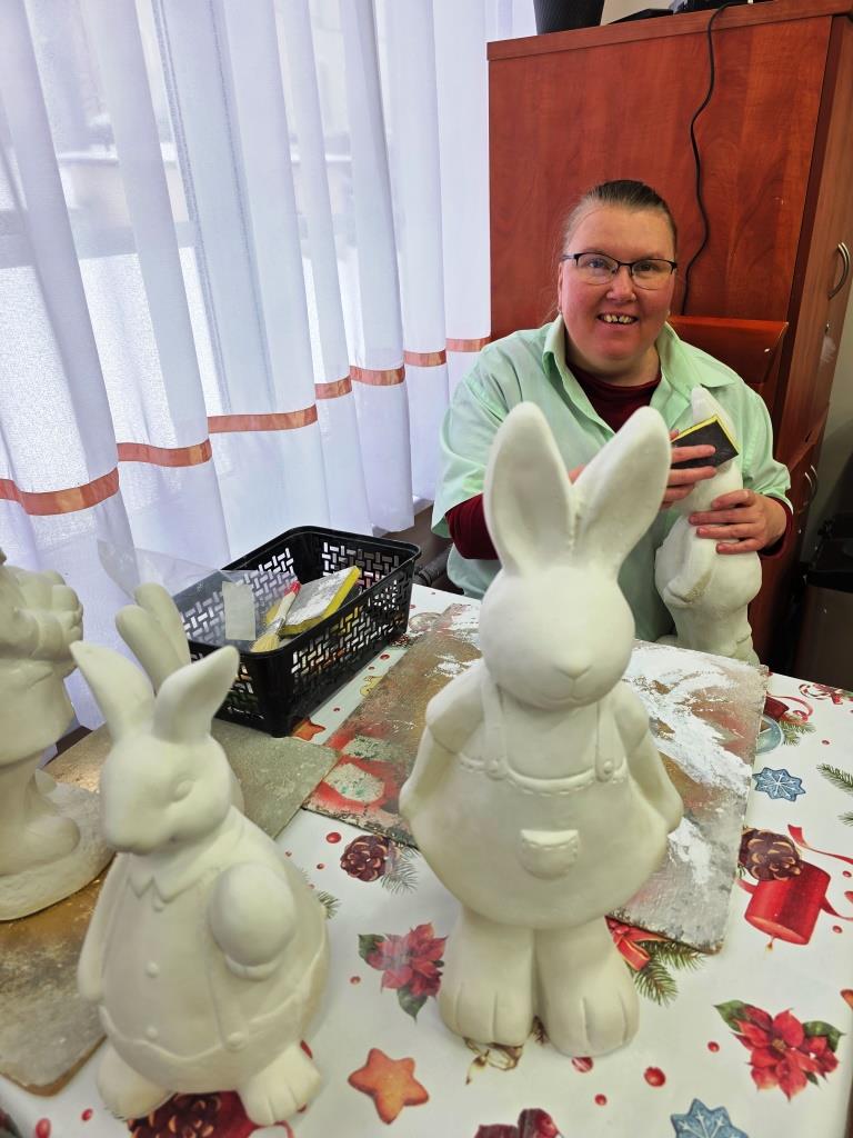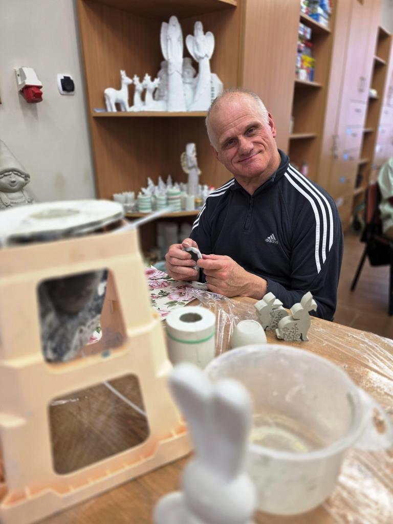 Marzec, 2026 r. Pracownia ceramiczna, jedna z ośmiu pracowni zawodowych funkcjonujących w naszych WTZ, zajmuje się rehabilitacją osób niepełnosprawnych w zakresie nabywania umiejętności wytwarzania przedmiotów o charakterze dekoracyjnym jak i użytkowym. W tej pracowni uczestnicy poznają historię ceramiki, stosowania, przygotowania i obróbki materiałów ceramicznych, biorą udział w procesie wytwórczym ceramiki. W pracowni podopieczni wykonują masę ceramiczną odpowiednią do form gipsowych, z których powstają odlewy gipsowe: anioły, dekoracje świąteczne, figurki tematyczne jak również wiele innych ciekawych przedmiotów. Poprzez systematyczną pracę uczestnicy nabywają umiejętność projektowania, planowania i realizowania danego zadania krok po kroku: sporządzanie masy gipsowej, suszenie, szlifowanie, wielokrotne malowanie i lakierowanie figur gipsowych. Każdy w naszej pracowni znajdzie wśród unikalnych i niepowtarzalnych prac coś dla siebie.